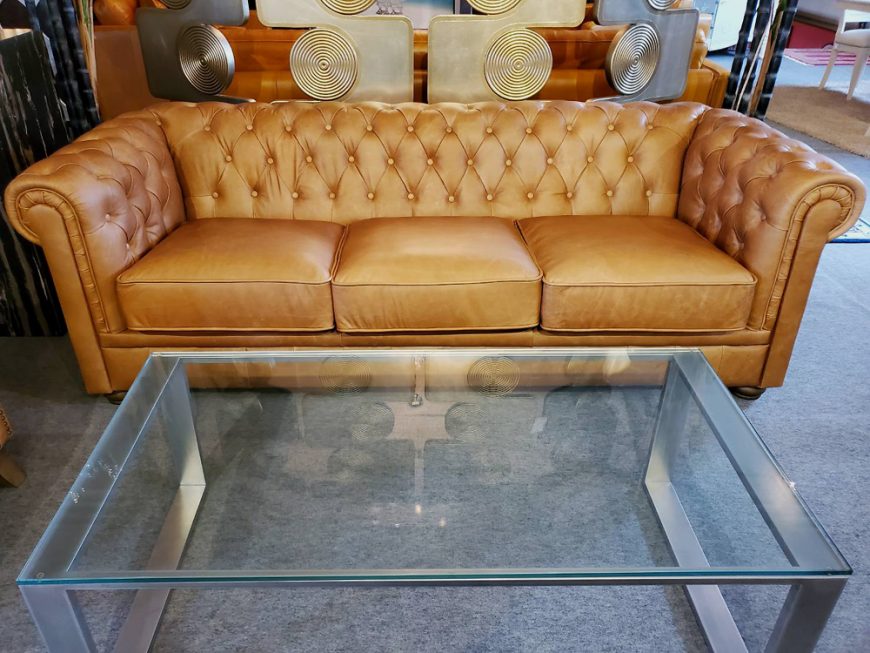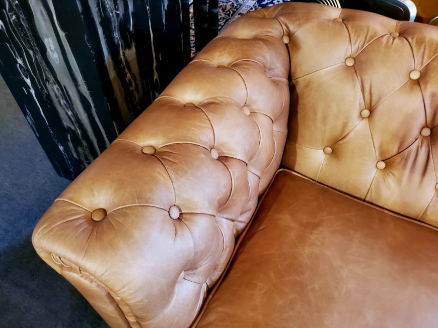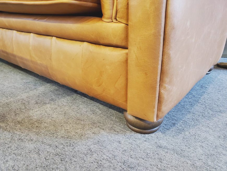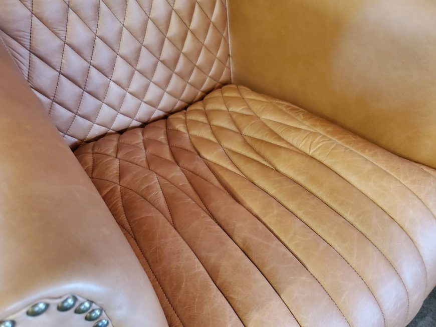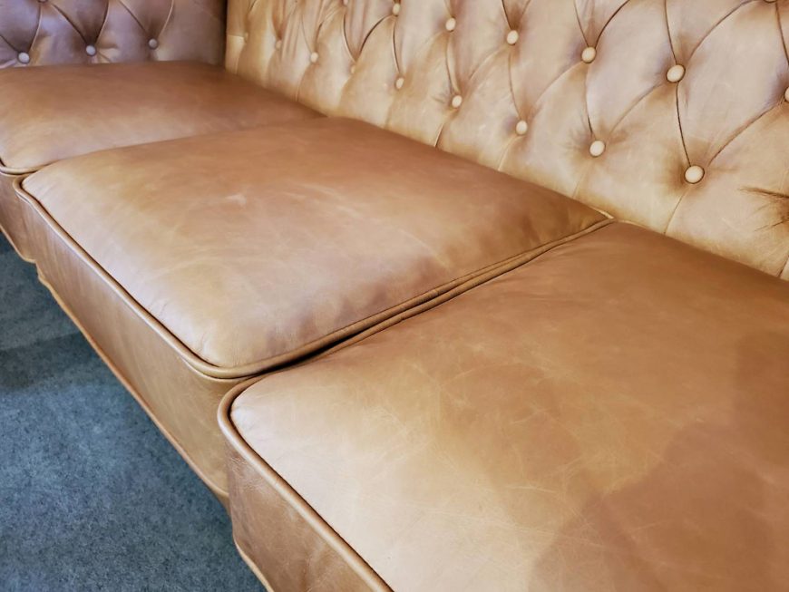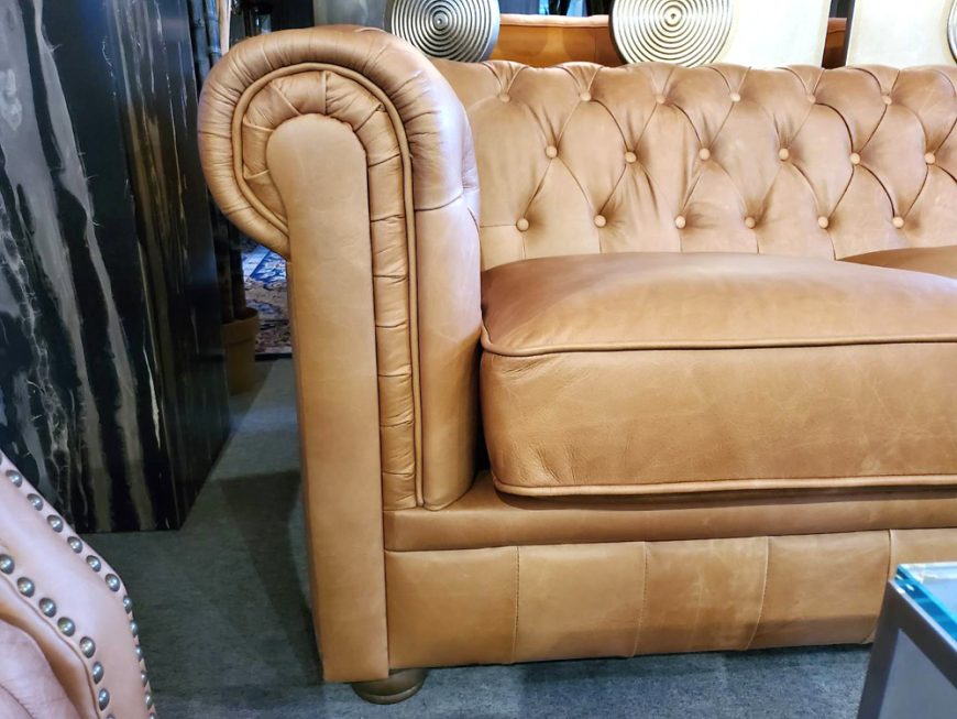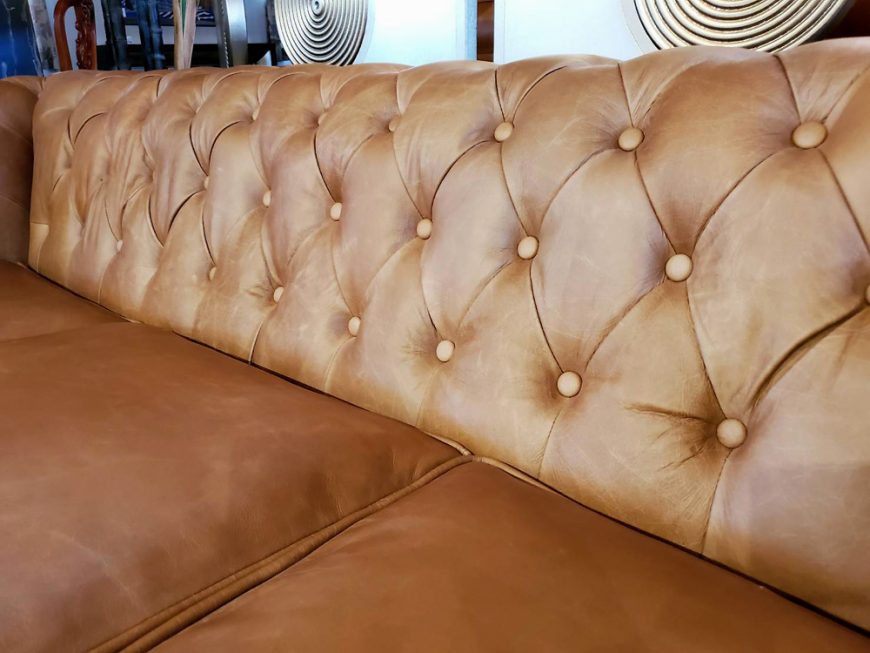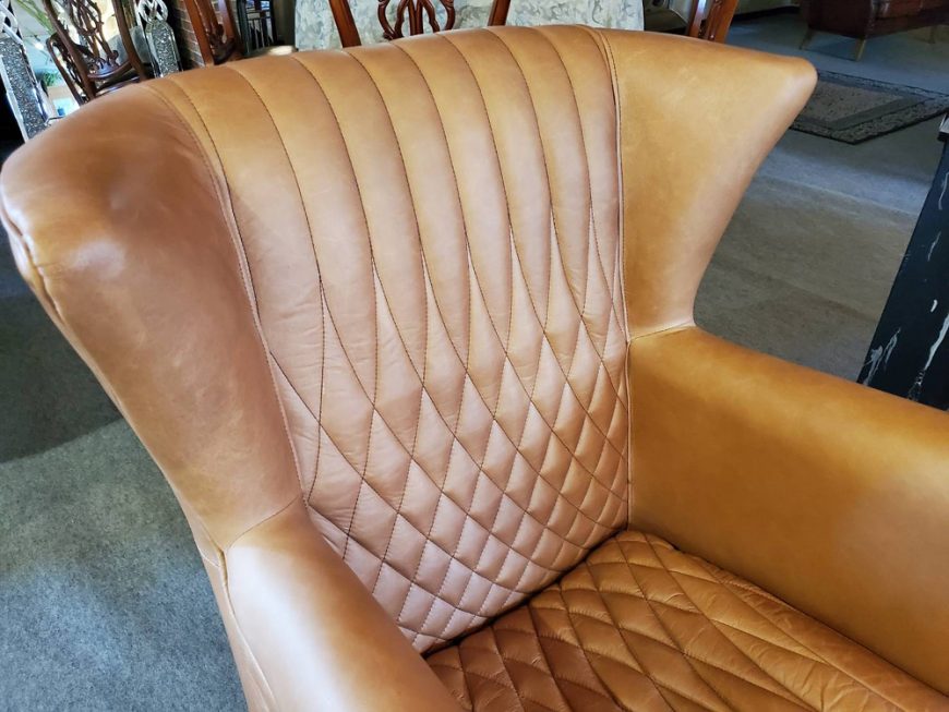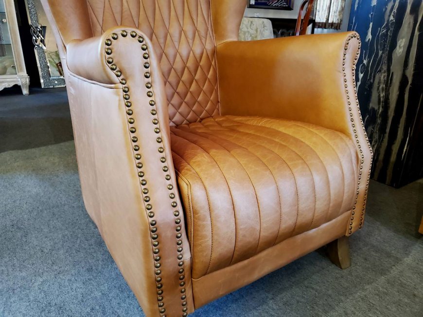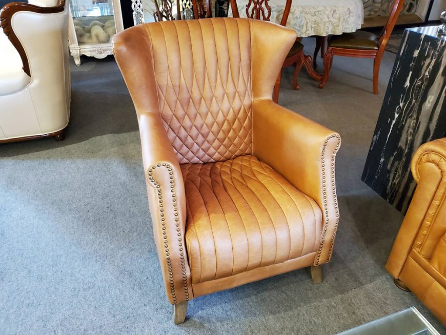 品のあるタン革を張りこみましたチェスターソファー&ウィングの入荷です。