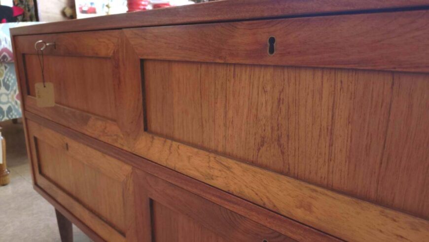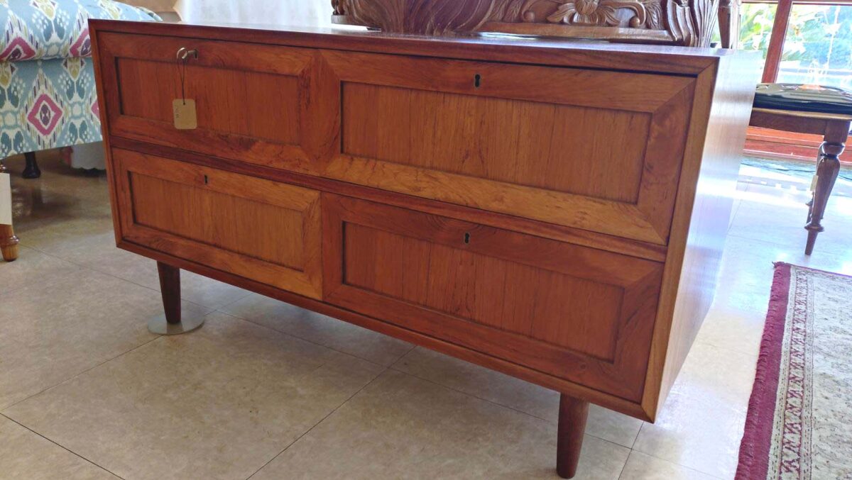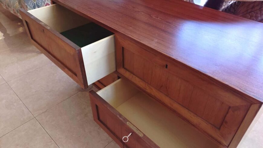 材質: チーク材が使用されており、前面の継ぎ目は留め継ぎ接合が特徴です。