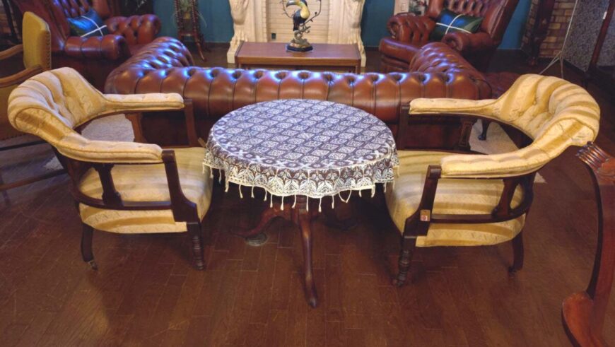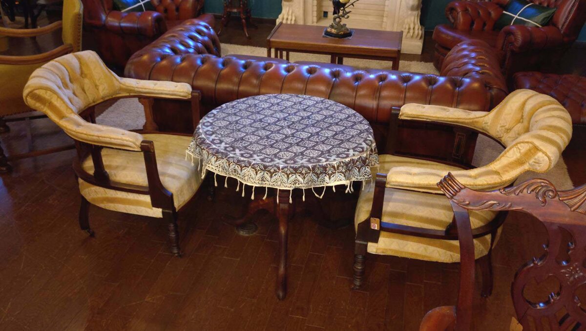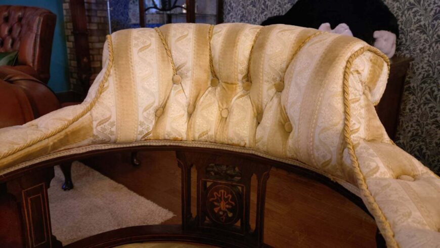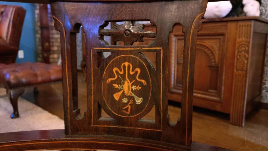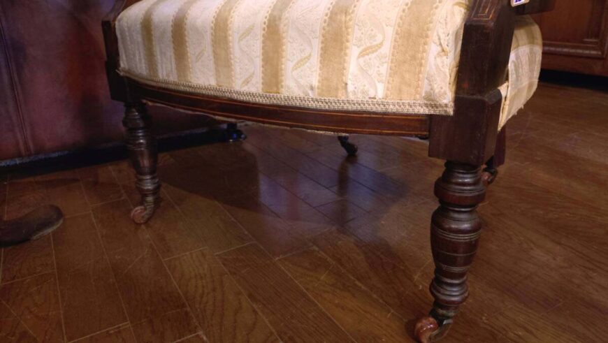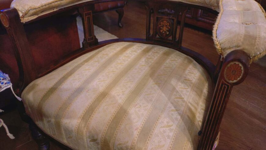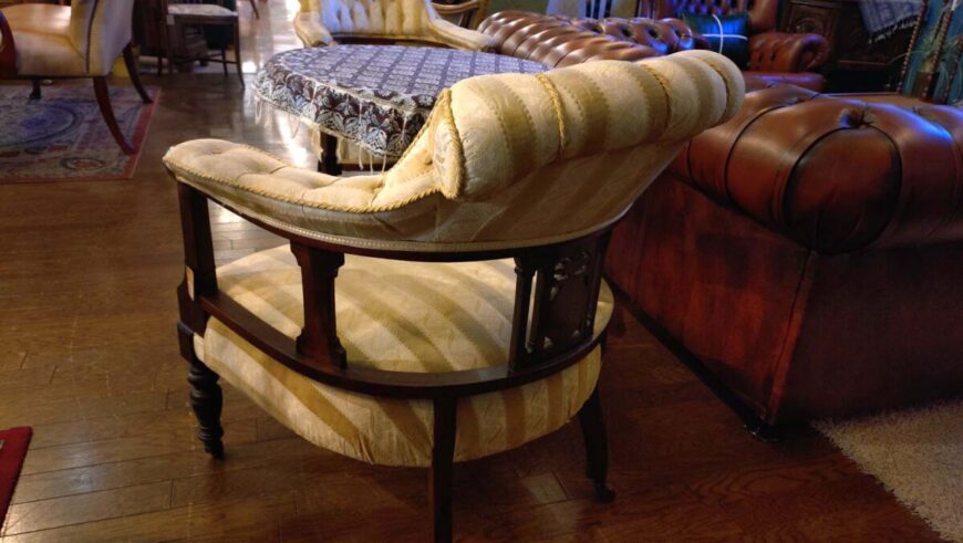 英国 1900年代~曲線の美しいフレームデザインと、体を包み込むような形状の背もたれが特徴です。座面と背もたれに使用されているゴールドストライプのファブリックは、上品でクラシックな雰囲気を演出優雅なアームとろくろ加工の脚が特徴的なヴィンテージチェアーで、マホガニーインレイ(象嵌細工)が施されています