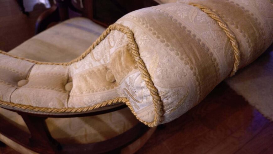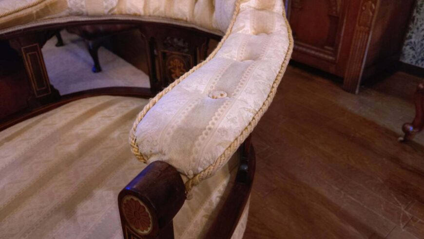 曲線の美しいフレームデザインと、体を包み込むような形状の背もたれが特徴です。座面と背もたれに使用されているゴールドストライプのファブリックは、上品でクラシックな雰囲気を演出優雅なアームとろくろ加工の脚が特徴的なヴィンテージチェアーで、マホガニーインレイ(象嵌細工)が施されています
