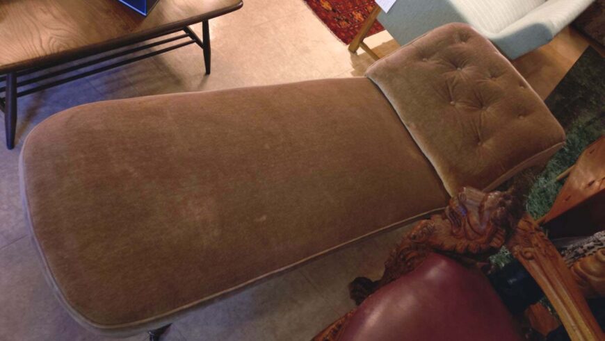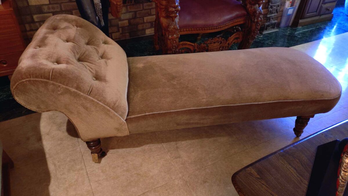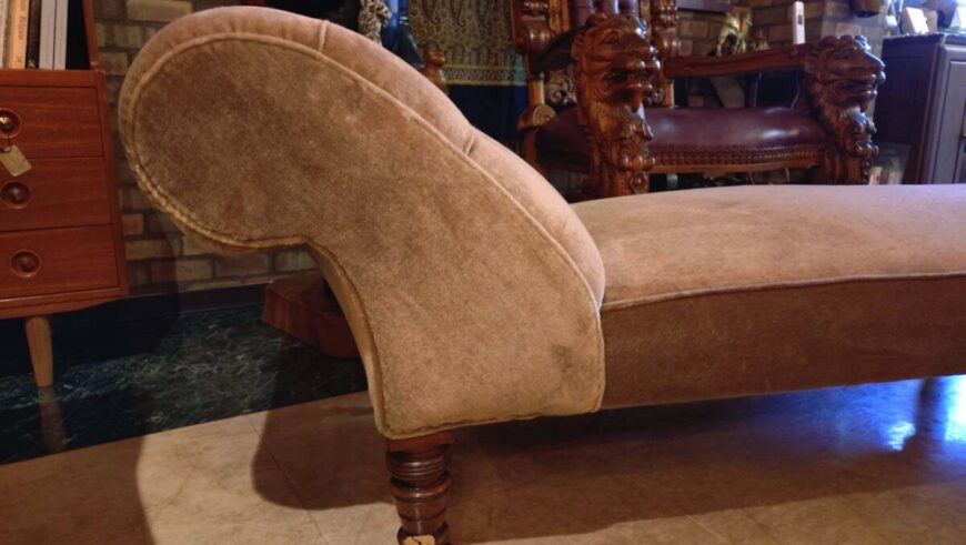 足を伸ばしてくつろぐために設計された寝椅子の一種です。旋盤加工された装飾的な脚部にはキャスターが付いており、移動が容易