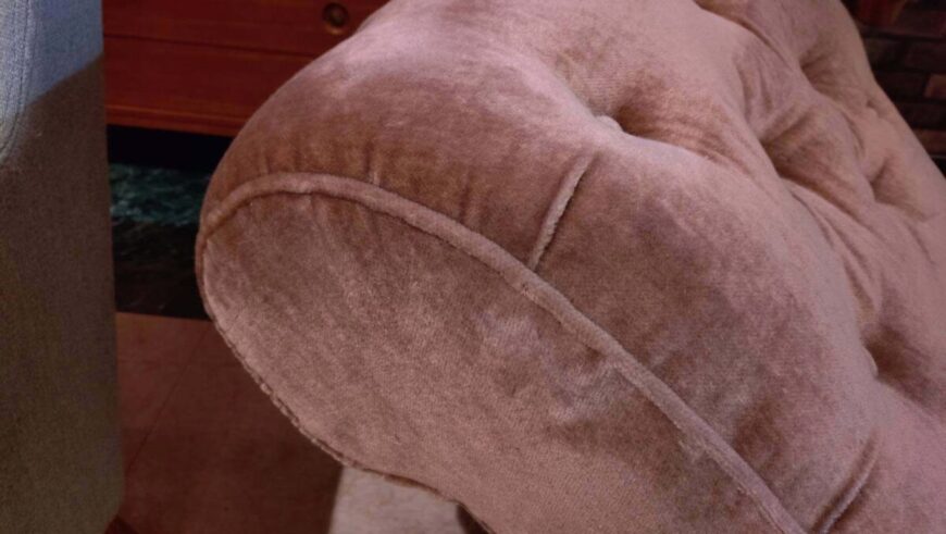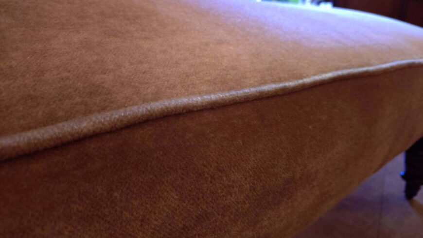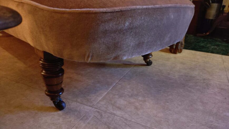 エドワード朝(1900年代)の英国製で、ベロア生地と旋盤加工されたウォールナット材材の脚が特徴です。